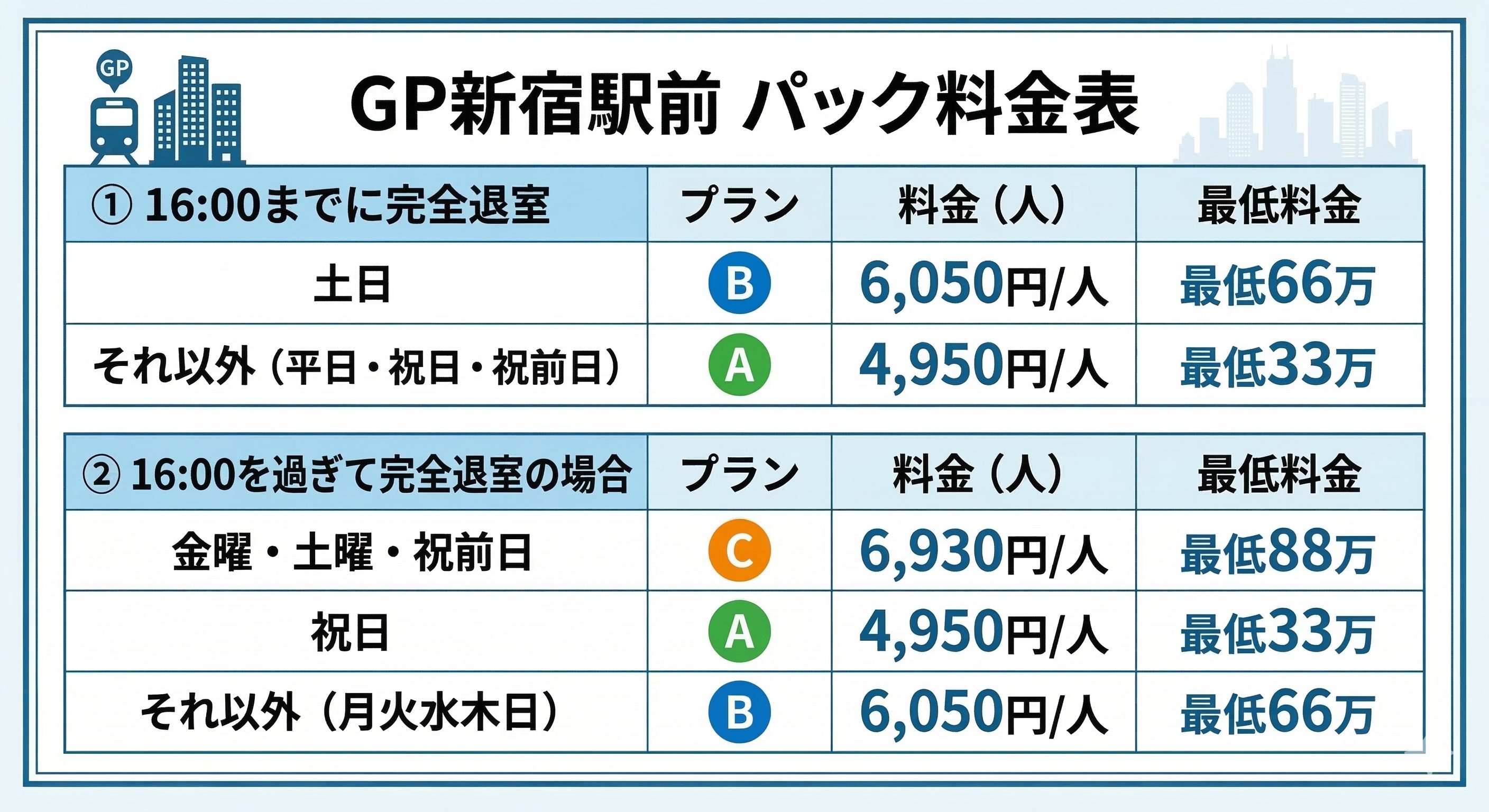 ※表示単価の下限は最安日程の目安です。曜日・退室時刻・料理の品数により単価は変動します。